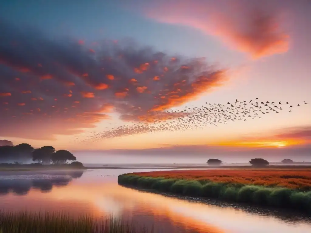 Un amanecer vibrante sobre humedal uruguayo muestra una diversidad de aves migratorias