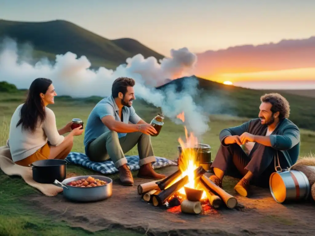 Un grupo de amigos disfrutando conservas caseras alrededor de una fogata en un camping de Uruguay, rodeados de naturaleza