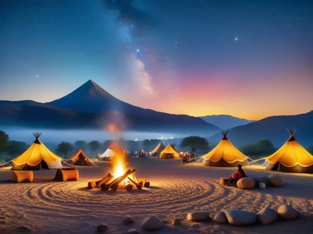 Campamento nocturno en la Fiesta Patria Gaucha, gauchos alrededor del fuego compartiendo historias bajo un cielo estrellado