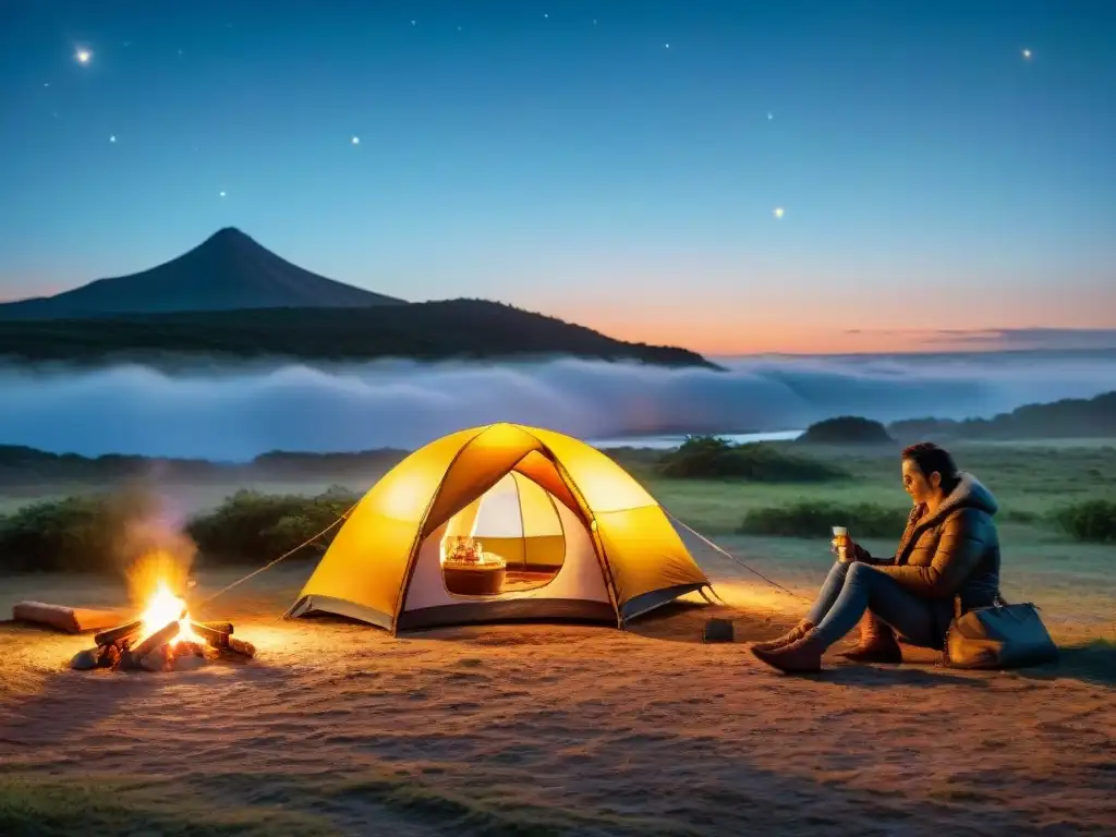 Acogedora escena familiar de camping en Uruguay al anochecer, con tienda iluminada y fogata