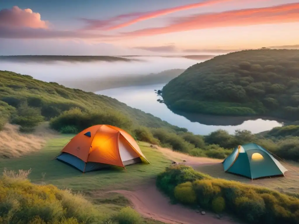 Un acogedor campamento en Uruguay al atardecer, con una tienda iluminada rodeada de vegetación, un lago tranquilo y el sol poniente