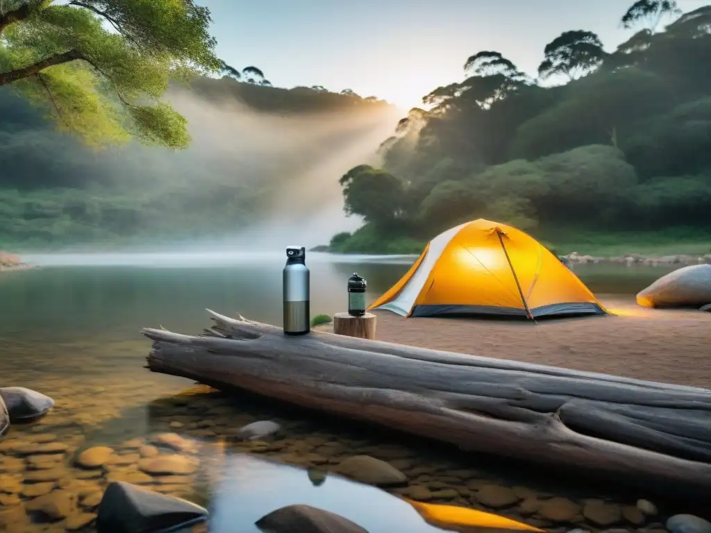 Escena serena en campamento en Uruguay con filtración de agua, resaltando los mejores filtros agua camping Uruguay