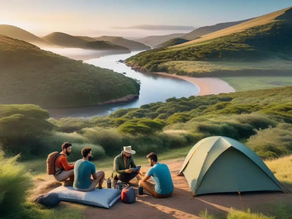 Grupo variado de campistas en Uruguay usando aplicaciones móviles de supervivencia en un escenario natural al atardecer