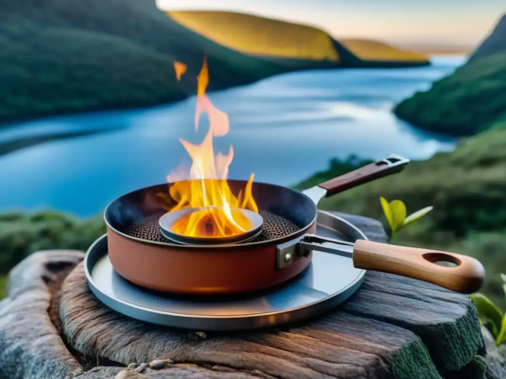 Grupo variado de campistas en Uruguay usando aplicaciones móviles de supervivencia en un escenario natural al atardecer