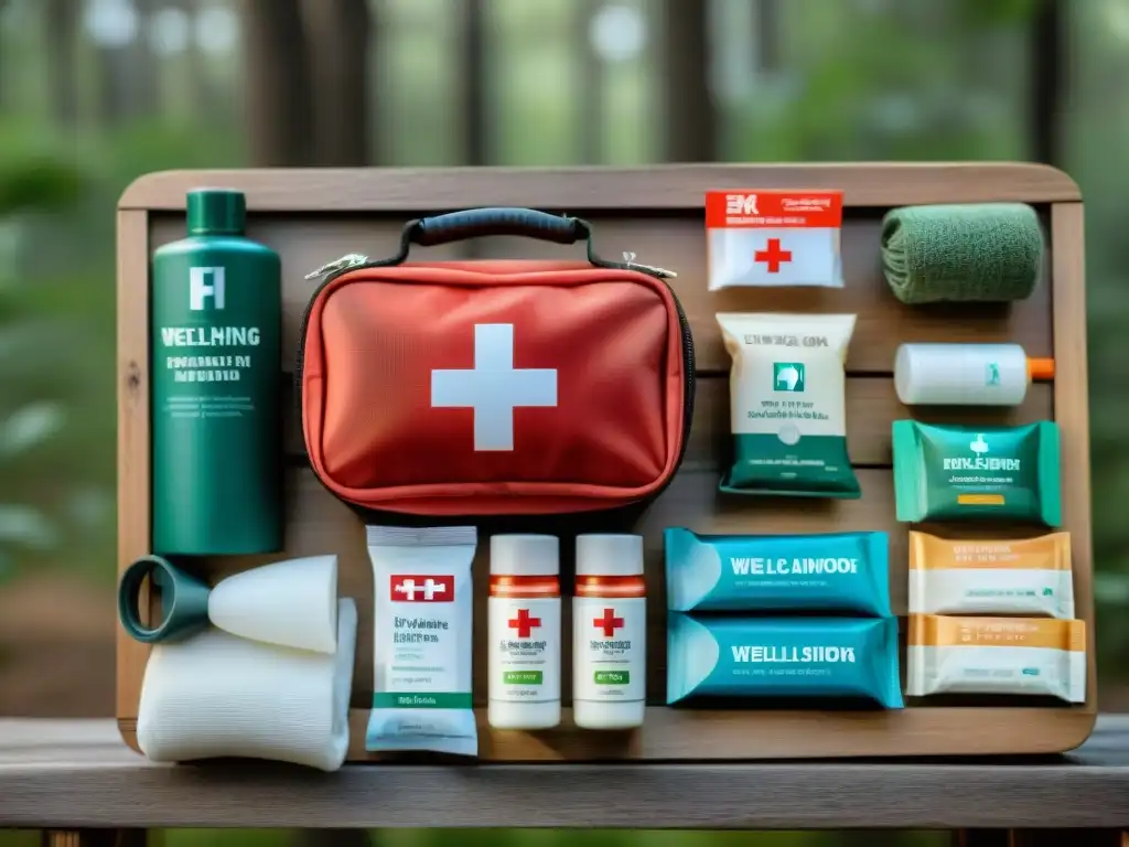 Un completo botiquín de camping uruguayo esencial, organizado y detallado en una mesa de madera en medio de un bosque verde exuberante