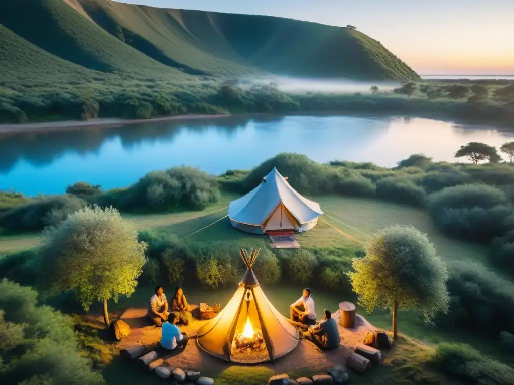 Un campamento colorido entre bosques verdes y ríos, en armonía con la naturaleza de Uruguay
