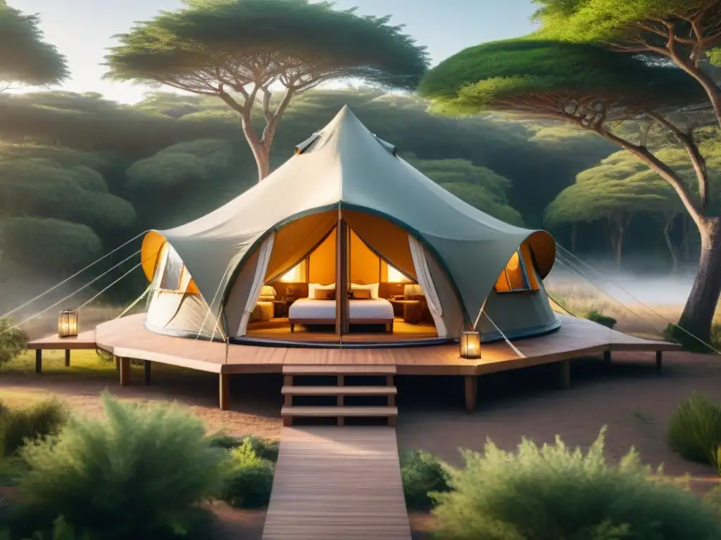 Glamping ecológico en Uruguay: Tienda lujosa en bosque verde, amueblada con materiales sostenibles y rodeada de naturaleza serena