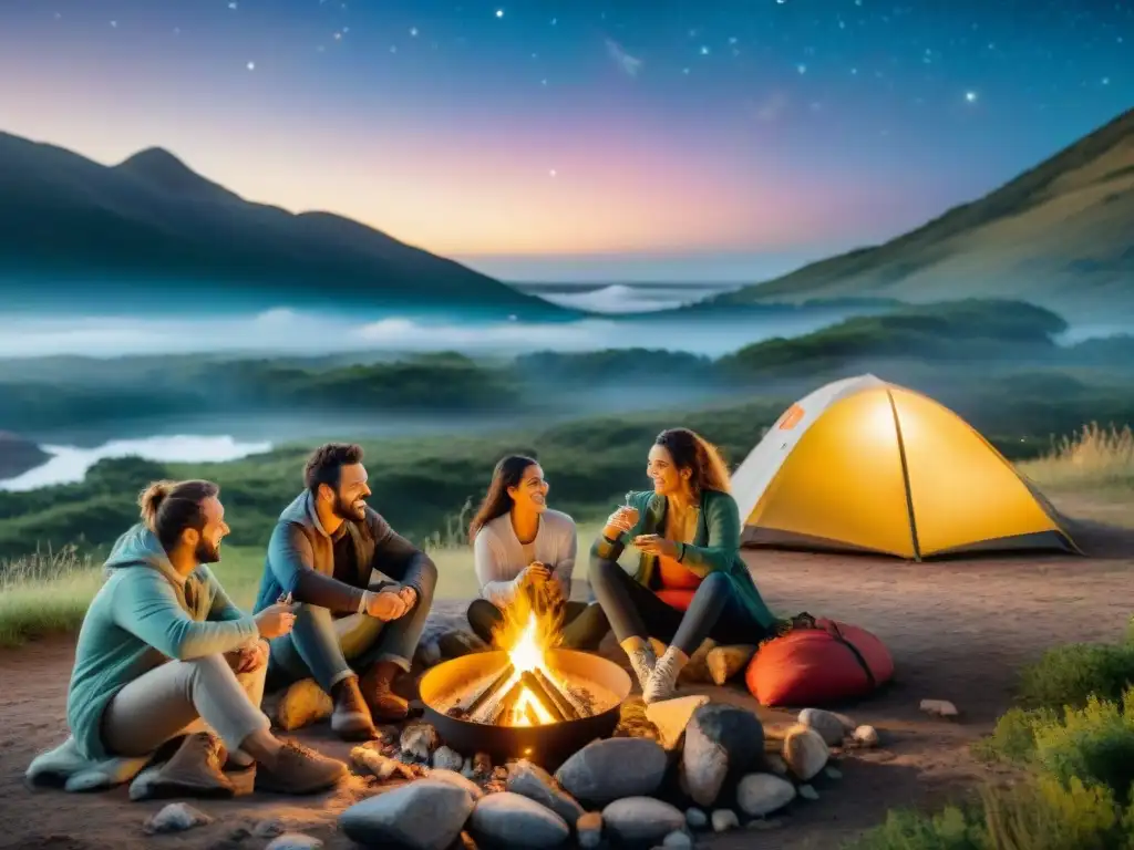 Familia disfruta de camping en Uruguay, compartiendo historias alrededor de fogata