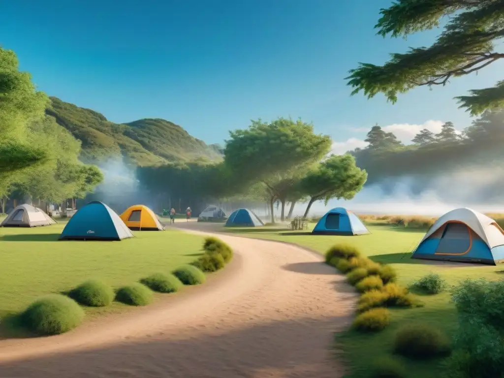Un campamento familiar en Uruguay: árboles verdes, río sereno, tiendas de colores, fogata acogedora y campistas felices disfrutando de la naturaleza